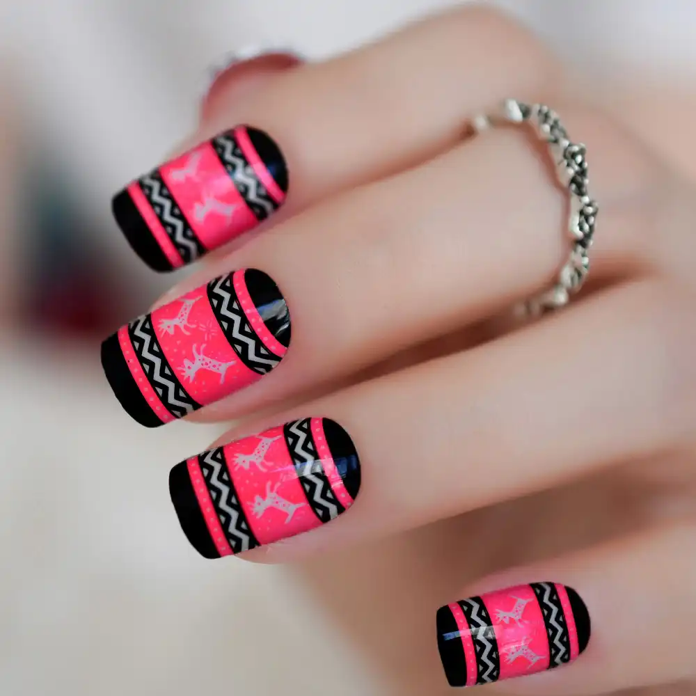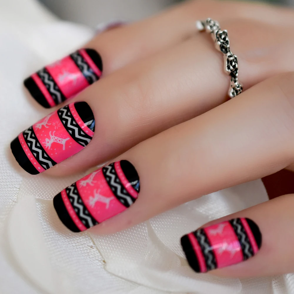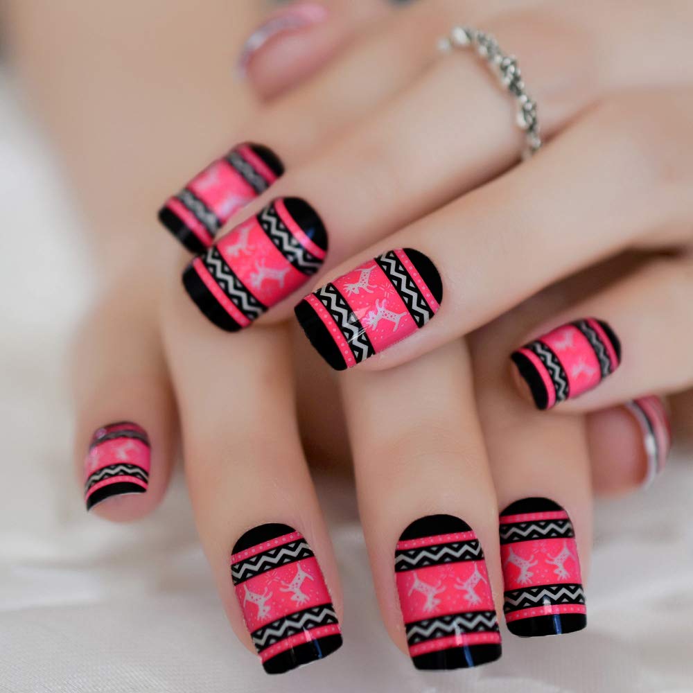 Us 1 27 15 Off Merry Christmas Nail Art Decoration Rose Red Xmas Deer Fake Nails Medium Square Designed Nail Tips In Box 24 In False Nails From
